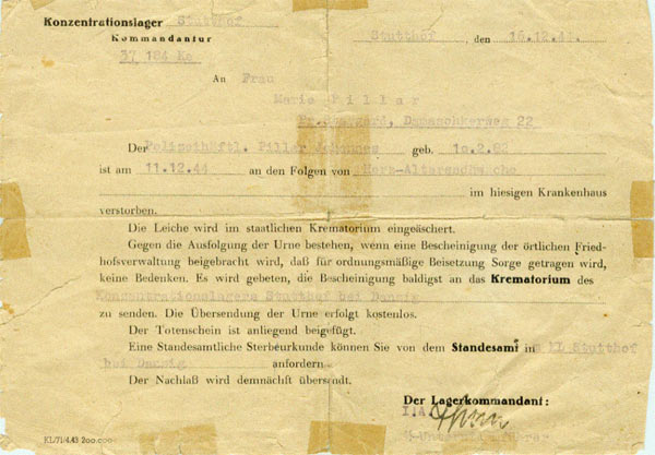 Zawiadomienie komendanta obozu Stutthof o śmierci Jana Pillara. Wdowa po Janie – Maria Pillarowa – odmówiła wówczas przyjęcia urny z prochami męża z rąk obozowych morderców. Postanowiła pamięć Męża uczcić modlitwą.
