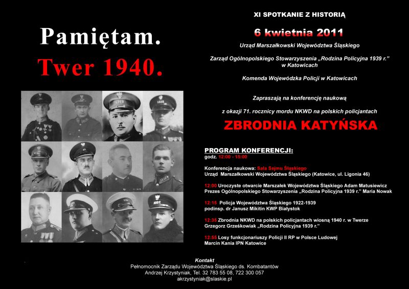 Urząd Marszałkowski Województwa Śląskiego, Zarząd Ogólnopolskiego Stowarzyszenia „Rodzina Policyjna 1939 r.” w Katowicach oraz Komenda Wojewódzka Policji w Katowicach zorganizowały konferencję naukową z okazji 71. rocznicy mordu NKWD na polskich policjantach pt.„Zbrodnia Katyńska”, która odbyła się 6 kwietnia 2011 w Sali Sejmu Śląskiego w Urzędzie Marszałkowskim w Katowicach (ul. Ligonia 46) .