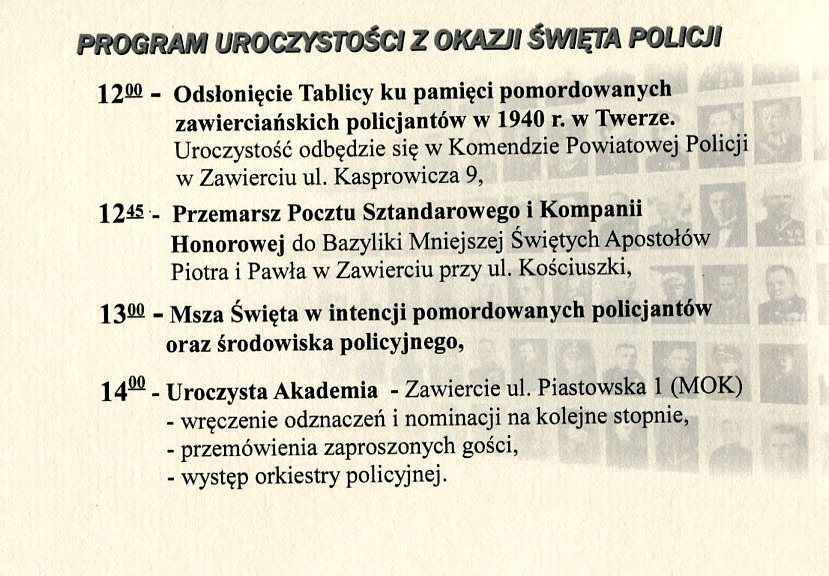 28 lipca 2011 r. w Komendzie Powiatowej Policji w Zawierciu (ul. Kasprowicza 9) odbyły się uroczystości z okazji Święta Policji. Zorgaqnizowane zostały przez Komendę Powiatową Policji w Zawierciu wraz z Regionem IPA Zawiercie. O godz. 12.00 została odsłonięta tablica upamiętniająca pomordowanych przez NKWD w 1940 r. w Twerze zawierciańskich policjantów. Następnie uczestnicy uroczystości wzięli udział w przemarszu pocztów sztandarowych i kompanii honorowej Policji do Bazyliki Mniejszej pw. Świętych Apostołów Piotra i Pawła w Zawierciu (ul. Kościuszki), gdzie odprawiona została Msza Św. w intencji zamordowanych policjantów i całego środowiska policyjnego. Ostatnim etapem obchodów policyjnego święta była uroczysta akademia w Miejskim Ośrodku Kultury w Zawierciu (ul. Piastowska 1), której towarzyszyła wystawa poświęcona historii zawierciańskiej Policji. W ustalaniu nazwisk zgładzonych przez NKWD policjantów i przygotowaniu wystawy uczestniczył Marcin Kania (Oddział IPN w Katowicach), który w trakcie uroczystości przedstawił referat na temat dziejów zawierciańskiej Policji w okresie II Rzeczypospolitej oraz zbrodnię NKWD na policjantach.