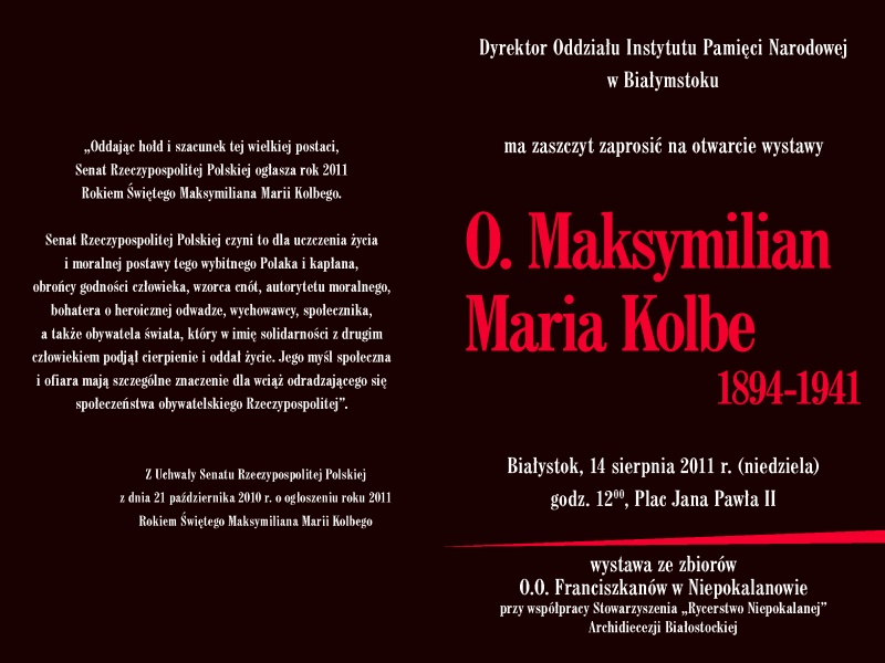 W dniu 14 sierpnia 2011 r. na placu Jana Pawła II w Białymstoku, z okazji zakończenia Roku Kolbiańskiego, została otwarta wystawa „Ojciec Maksymilian Maria Kolbe (1894–1941)”, przygotowana przez OBEP IPN w Białymstoku przy współpracy Stowarzyszenia „Rycerstwo Niepokalanej” Archidiecezji Białostockiej w oparciu o zbiory OO. Franciszkanów z Niepokalanowa. W otwarciu wziął udział m.in. ks. abp prof. Edward Ozorowski, metropolita białostocki, oraz Stanisław Marczuk, przewodniczący Zarządu Regionu Białystok NSZZ „Solidarność” w latach 1981–1989. Wystawę można zwiedzać do 6 września.