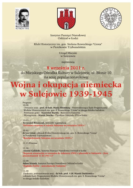 Sesję popularnonaukową pt. „Wojna i okupacja niemiecka w Sulejowie 1939–1945” zorganizowały 8 września 2011 r. Oddział Instytutu Pamięci Narodowej w Łodzi, Klub Historyczny im. gen. Stefana Roweckiego „Grota” w Piotrkowie Trybunalskim oraz Urząd Miejski w Sulejowie. Sesja odbyła się w Miejskim Ośrodku Kultury w Sulejowie (ul. Błonie 10).