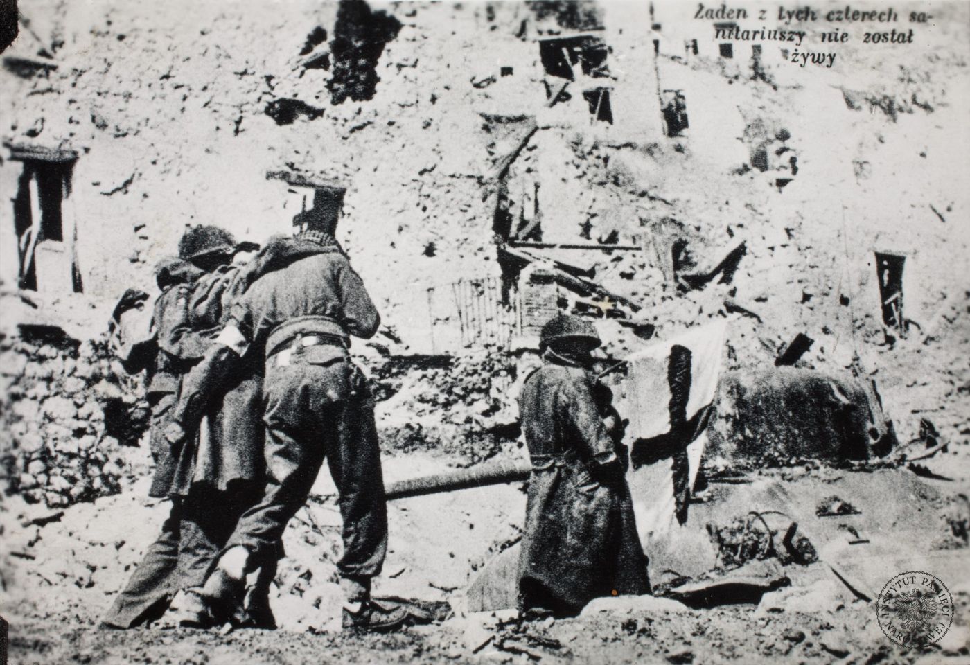 1. Polscy żołnierze niosą i prowadzą rannych. Na drugim planie klasztor na Monte Cassino.