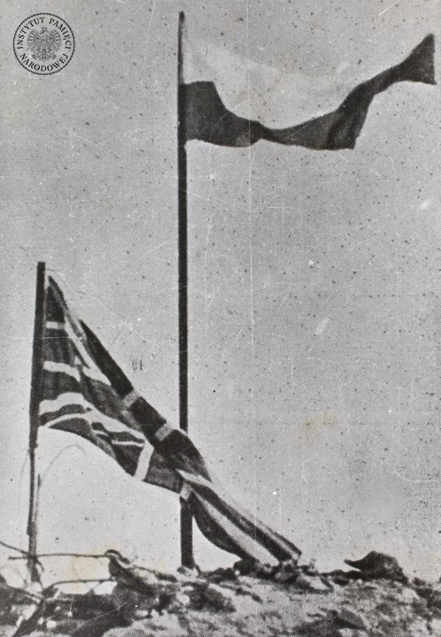 10. Flaga polska i brytyjska zatknięte na ruinach klasztoru Benedyktynów na Monte Cassino.