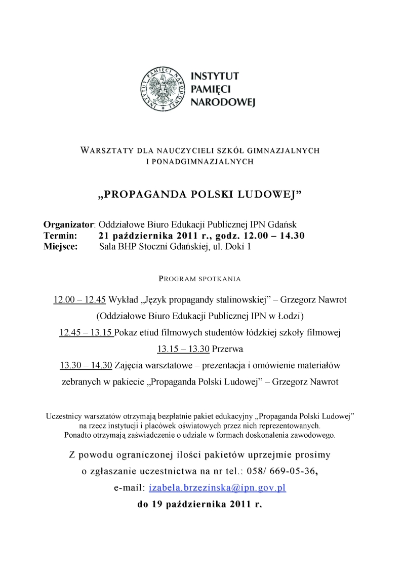 21 października br. w historycznej Sali BHP na terenie Stoczni Gdańskiej (ul. Doki 1) odbyły się warsztaty dla nauczycieli szkół gimnazjalnych i ponadgimnazjalnych pt. „Propaganda Polski Ludowej”. Uczestnicy warsztatów otrzymali bezpłatnie pakiet edukacyjny „Propaganda Polski Ludowej” na rzecz instytucji i placówek oświatowych przez nich reprezentowanych. Ponadto otrzymali także zaświadczenie o udziale w formach doskonalenia zawodowego.