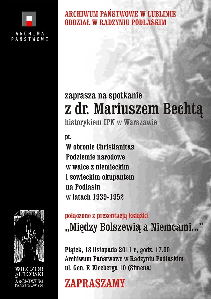 18 listopada 2011 w Archiwum Państwowym w Radzyniu Podlaskim, przy ul. gen. Franciszka Kleeberga 10, dr Mariusz Bechta z Oddziałowego Biura Edukacji Publicznej IPN w Warszawie wystąpił z referatem „W obronie Christianitas. Podziemie narodowe w walce z niemieckim i sowieckim okupantem na Podlasiu 1939–1952”. Wykład połączony był z prezentacją książki „… między Bolszewią a Niemcami. Konspiracja polityczna i wojskowa Polskiego Obozu Narodowego na Podlasiu w latach 1939–1952”.