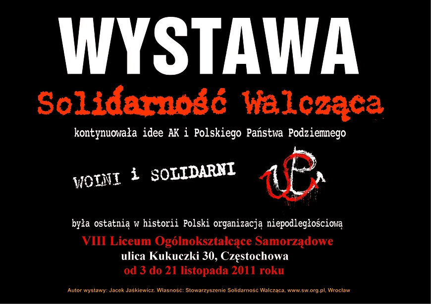 W dniach 3–21 listopada 2011 r. w VIII Liceum Ogólnokształcącym Samorządowym w Częstochowie (ul. Kukuczki 30) jest prezentowana wystawa „Wolni i solidarni”, przygotowana przez Jacka Jaśkiewicza z wrocławskiego Stowarzyszenia Solidarność Walcząca. Organizatorem prezentacji jest OBEP IPN w Katowicach we współpracy z VIII Liceum Ogólnokształcącym Samorządowym i Stowarzyszeniem Solidarność Walcząca we Wrocławiu.
