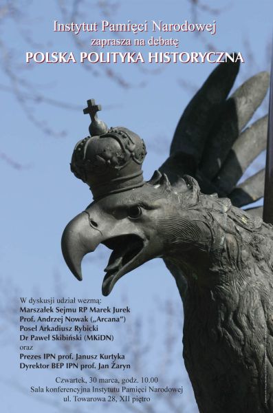 Czy Polsce potrzebna jest polityka historycznaω A jeśli tak, to jaka ona ma byćω Jaka jest znajomość ojczystych dziejów w naszym społeczeństwieω Czy potrafimy przedstawić innym narodom obraz polskiej historiiωW Instytucie Pamięci Narodowej 30 marca 2006 r., odbyła się debata: „Polska polityka historyczna”, w której udział wzięli Marszałek Sejmu RP Marek Jurek, prof. Andrzej Nowak („Arcana”), poseł Arkadiusz Rybicki, dr Paweł Skibiński (MKiDN) oraz prezes IPN dr hab. Janusz Kurtyka i dyrektor BEP IPN dr hab. Jan Żaryn.