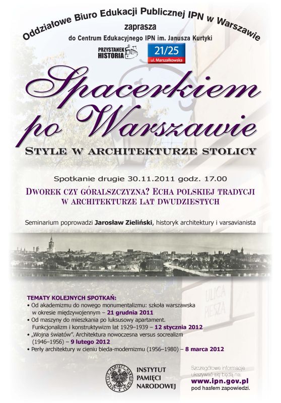 Szósta edycja wykładów dla nauczycieli historii, języka polskiego, wiedzy o społeczeństwie, studentów kierunków humanistycznych oraz uczniów wybierających tematy związane z kulturą i historią najnowszą do ustnej prezentacji maturalnej z języka polskiego. Proponujemy sześć spotkań w cyklu miesięcznym (październik 2011 – marzec 2012), prezentujących różnorodność stylistyczną architektury Warszawy na przestrzeni XIX i XX w. Przedstawione zostaną założenia architektoniczne/urbanistyczne i ich stylistyka (gmachy użyteczności publicznej, obiekty przemysłowe, architektura sportowa i rekreacyjna, architektura mieszkaniowa, obiekty kultu) oraz ich wpływ na kształt miasta i życie mieszkańców – na tle historycznym, społecznym i ideologicznym.