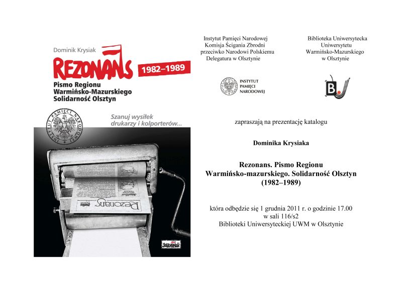 W dniu 1 grudnia 2011 r. w Bibliotecei Uniwersytetu Warmińsko-Mazurskiego (ul. Oczapowskiego 12 B) odbyła się prezentacja publikacji „Rezonans. Pismo Regionu Warmińsko-Mazurskiego. Solidarność Olsztyn (1982–1989)” autorstwa Dominika Krysiaka z Delegatury IPN w Olsztynie.