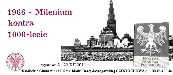 W dniach od 2 do 22 grudnia 2011 r. w Katolickim Gimnazjum i Liceum Ogólnokształcącym im. Matki Bożej Jasnogórskiej w Częstochowie (ul. Okólna 113A) prezentowana jest wystawa „1966 – Millenium kontra 1000-lecie”.