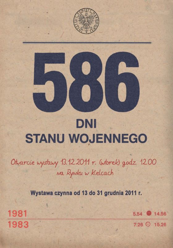 13 grudnia 2011 r. o godz. 12.00 na Rynku w Kielcach odbyło się otwarcie wystawy plenerowej „586 dni stanu wojennego”, przygotowanej przez Biuro Edukacji Publicznej Instytutu Pamięci Narodowej oraz Oddziałowe Biuro Edukacji Publicznej IPN w Krakowie Delegaturę w Kielcach.