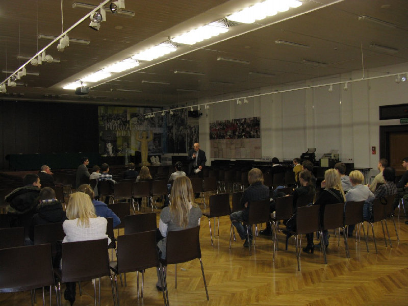 Uczniowie spotkali się także z organizatorem wspomnianego strajku, panem Andrzejem Kołodziejem. Opowiedział on m.in. o „miasteczku” styropianowych domków, które powstało na terenie stoczni.