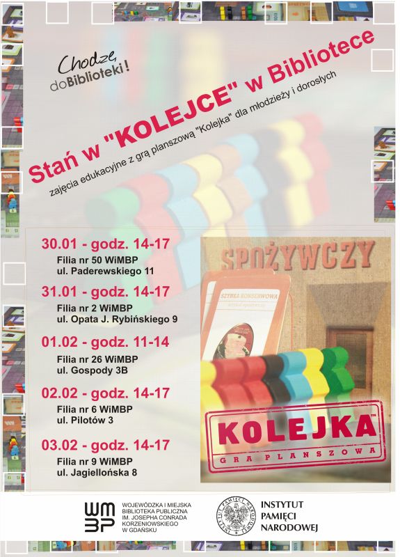 Spotkania z najpopularniejszą grą planszową wydaną przez IPN: „Kolejką”, adresowane do młodzieży oraz dorosłych. Zajęcia z „Kolejką” odbędą się wybranych filiach Wojewódzkiej i Miejskiej Biblioteki Publicznej w Gdańsku. W zajęciach wezmą udział także historycy z IPN, którzy będą służyli pomocą w wytłumaczeniu reguły rozgrywek czy zawiłości historycznych związanych z prezentowanymi w grze zjawiskami, procesami czy przedmiotami.