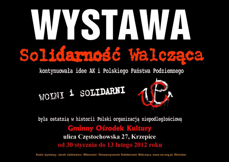 W dniach od 30 stycznia do13 lutego 2012 r. w Gminnym Ośrodku Kultury w Krzepicach (ul. Częstochowska 27) prezentowana jest wystawa „Wolni i Solidarni”, przygotowana przez Jacka Jaśkiewicza z wrocławskiego Stowarzyszenia Solidarność Walcząca. Organizatorem prezentacji wystawy jest OBEP IPN w Katowicach we współpracy z Gminnym Ośrodkiem Kultury w Krzepicach i Stowarzyszeniem Solidarność Walcząca we Wrocławiu.