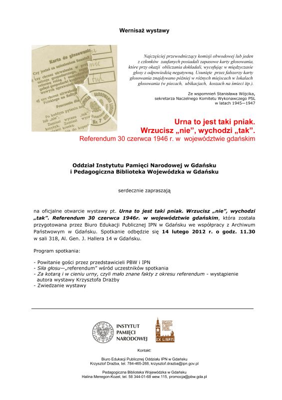 14 lutego br. została oficjalnie otwarta w Gdańsku wystawa „Urna to jest taki pniak. Wrzucisz »nie«, wychodzi »tak«. Referendum 30 czerwca 1946 r. w województwie gdańskim”. Wernisaż wystawy odbył się w Pedagogicznej Bibliotece Wojewódzkiej im. Macierzy Szkolnej w Gdańsku, przy al. gen. J. Hallera 14.