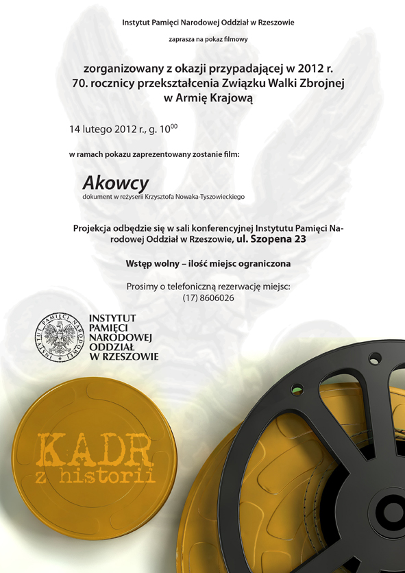 Instytut Pamięci Narodowej Oddział w Rzeszowie zaprosił widzów na kolejny pokaz filmowy, zorganizowany w ramach obchodów 70. rocznicy przekształcenia Związku Walki Zbrojnej w Armię Krajową. Pokaz odbył się 14 lutego 2012 r. w budynku IPN przy ul. Szopena 23. Zaprezentowany został dokument w reżyserii Krzysztofa Nowaka-Tyszowieckiego „Akowcy”.