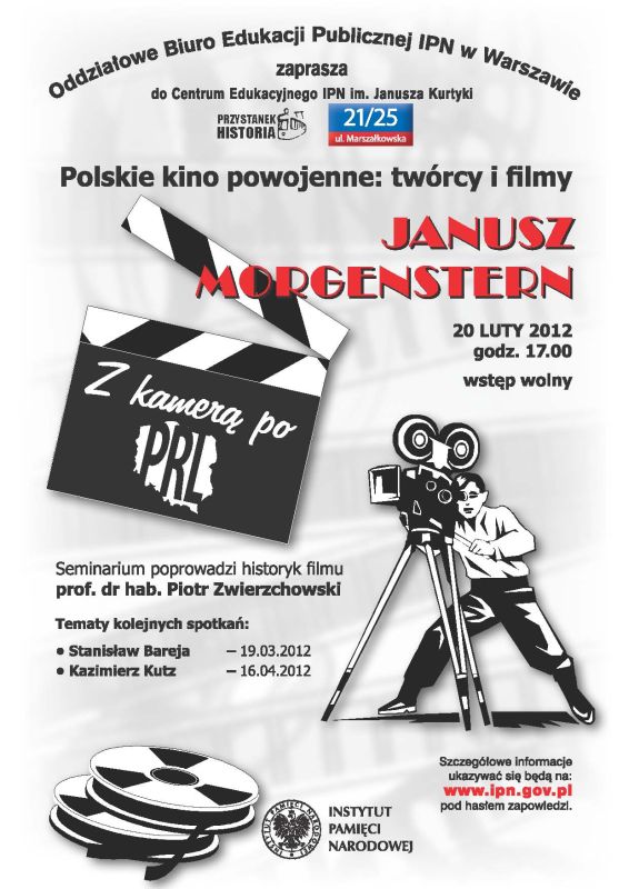 Nowa edycja wykładów „Z kamerą po PRL-u”, przedstawiających wybitnych polskich reżyserów filmowych i ich osiągnięcia artystyczne na tle ówczesnej rzeczywistości politycznej, społecznej i kulturowej. Spróbujemy opowiedzieć o bardzo różnych zjawiskach charakterystycznych dla powojennego kina polskiego; zarówno tych, które wprost wynikały z polityki kulturalnej tamtego okresu, jak i tych niezależnych artystycznie. Oprócz arcydzieł polskiego kina, pokazane zostaną także fragmenty filmów o jednoznacznie propagandowym zabarwieniu. Seminarium adresowane jest do nauczycieli historii, języka polskiego, wiedzy o społeczeństwie, studentów kierunków humanistycznych oraz uczniów wybierających tematy związane z filmem i historią najnowszą do ustnej prezentacji maturalnej z języka polskiego. Proponujemy sześć spotkań w cyklu miesięcznym (październik 2011 – marzec 2012). Udział w seminarium – jako forma doskonalenia zawodowego – zostanie potwierdzony pisemne.