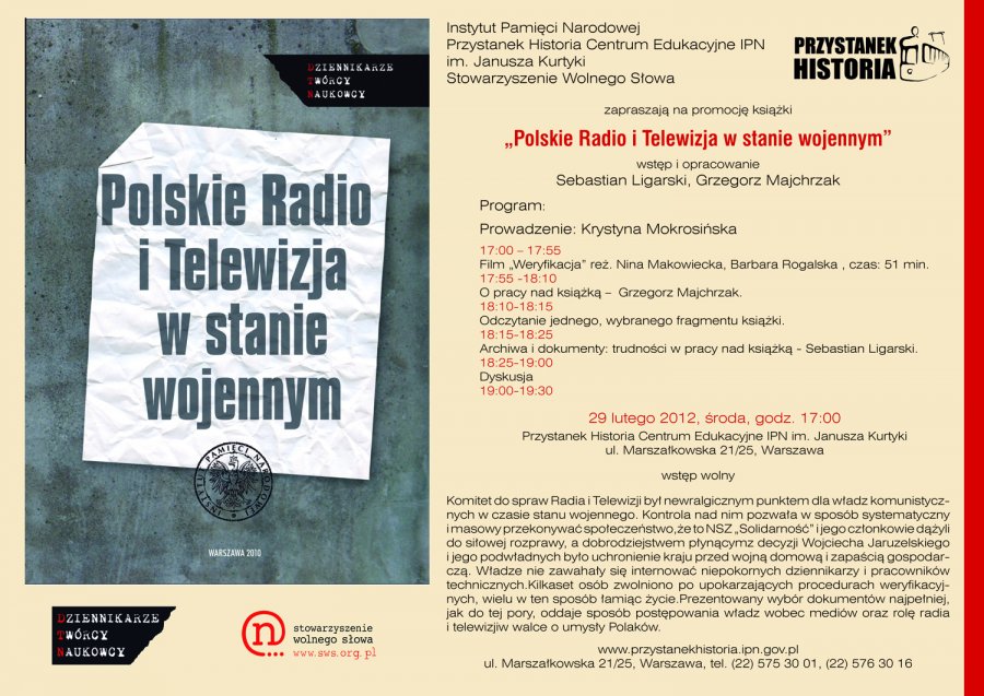 Książka „Polskie Radio i Telewizja w stanie wojennym” to pierwsza tak obszerna publikacja na temat funkcjonowania Komitetu ds. Radia i Telewizji po 13 grudnia oraz przygotowań do wprowadzenia stanu wojennego w tej instytucji. W spotkaniu – prowadzonym przez Krystynę Mokrosińską – wzięli udział bohaterowie tamtych wydarzeń. Interesujące dla każdego uczestnika było porównanie stylu zarządzania mediami 30 lat temu i dzisiaj.