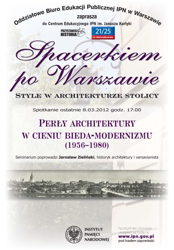 Szósta edycja wykładów dla nauczycieli historii, języka polskiego, wiedzy o społeczeństwie, studentów kierunków humanistycznych oraz uczniów wybierających tematy związane z kulturą i historią najnowszą do ustnej prezentacji maturalnej z języka polskiego. Proponujemy sześć spotkań w cyklu miesięcznym (październik 2011 – marzec 2012) prezentujących różnorodność stylistyczną architektury Warszawy na przestrzeni XIX i XX w. Przedstawione zostaną założenia architektoniczne/urbanistyczne i ich stylistyka (gmachy użyteczności publicznej, obiekty przemysłowe, architektura sportowa i rekreacyjna, architektura mieszkaniowa, obiekty kultu) oraz ich wpływ na kształt miasta i życie mieszkańców – na tle historycznym, społecznym i ideologicznym.