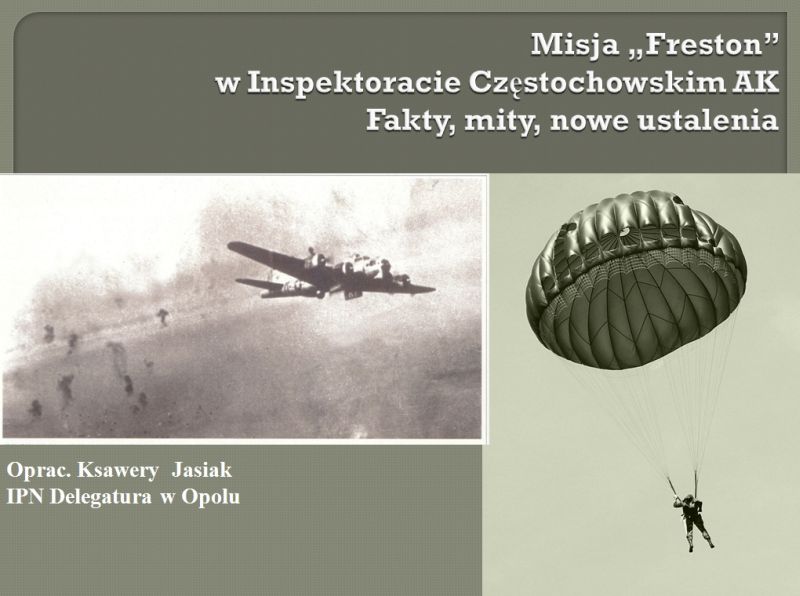 Dr Ksawery Jasiak na podstawie kwerendy, którą przeprowadził w brytyjskich archiwach, przedstawił historię alianckiej misji wojskowej, zrzuconej na teren Inspektoratu Częstochowskiego AK w nocy z 26 na 27 grudnia 1944 r. Omówił również sytuację Armii Krajowej w ostatnich tygodniach przed wydaniem rozkazu o jej rozwiązaniu przez gen. Leopolda Okulickiego „Niedźwiadka”. Odpowiadał m.in. na pytania o przyczyny, cele i skutki misji. Zaprezentowane zostały sylwetki oficerów łącznikowych gen. L. Okulickiego „Niedźwiadka”: por. Alfonsa Kaszy ps. „Alm” i por. Szymona Zaremby ps. „Jerzy”, którzy zostali przydzieleni do ochrony misji.