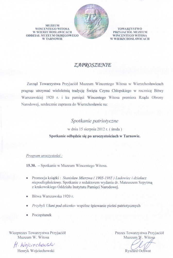 15 sierpnia 2012r. w Towarzystwo Przyjaciół Muzeum Wincentego Witosa w Wierzchosławicach odbędzie się promocja materiałów pokonferencyjnych "Stanisław Mierzwa 1905-1985. Ludowiec i działacz niepodległościowy". W ramach Spotkań Patriotycznych prelekcję wygłosi pracownik Oddziału IPN w Krakowie Mateusz Szpytma.