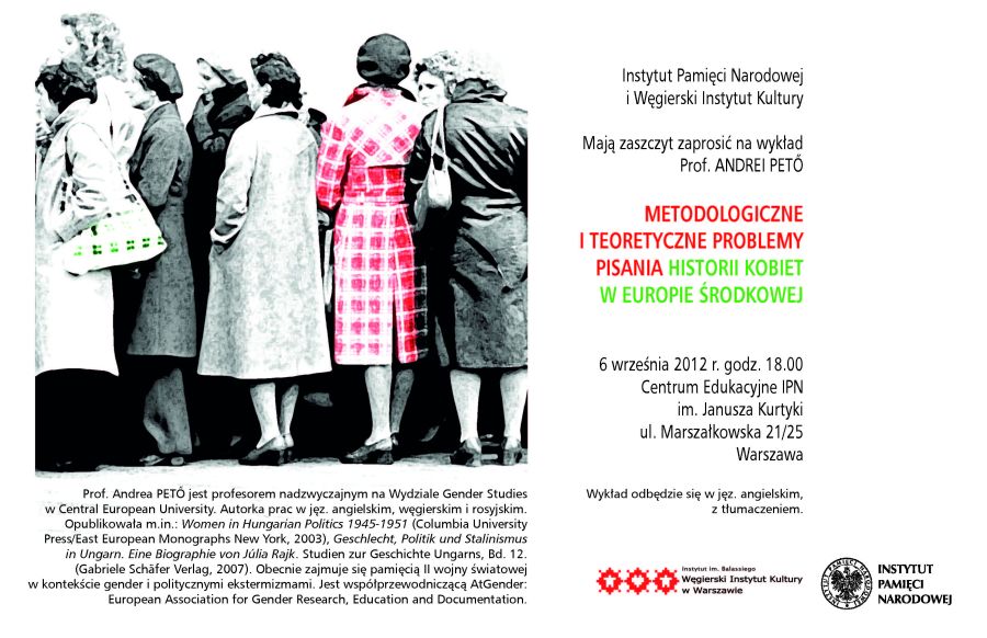 Wykład prof. Andrei Pető „Metodologiczne i teoretyczne problemy pisania historii kobiet w europie środkowej” odbył się 6 września 2012 r. o godz. 18.00 w Centrum Edukacyjnym IPN im. Janusza Kurtyki „Przystanek Historia” przy ul. Marszałkowskiej 21/25.