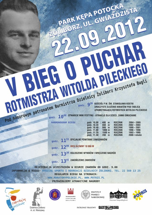 Gratka dla miłośników historii i sportu zarazem! W najbliższą sobotę na warszawskiej Kępie Potockiej (Żoliborz) odbędzie się już po raz piąty Bieg o Puchar Rotmistrza Witolda Pileckiego (1901–1948). Jak co roku uczestnicy biegu najpierw oddadzą cześć Witoldowi Pileckiemu, składając kwiaty przy tablicy pamiątkowej na fasadzie kościoła pw. św. Stanisława Kostki, a następnie udadzą się na miejsce rozgrywania zawodów sportowych, by o godz. 12.00 uczestniczyć w biegu głównym na 10 km. Zawodników będzie dopingowała Pani Zofia Pilecka-Optułowicz, córka Witolda Pileckiego, która da sygnał do startu i wręczy najlepszym puchary.