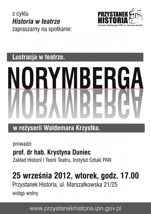 Z cyklu „Historia w teatrze”: „Lustracja w teatrze. »Norymberga« w reżyserii Waldemara Krzystka” – Warszawa, 25 września 2012, „Przystanek Historia” – Centrum Edukacyjne IPN im. Janusza Kurtyki, Marszałkowska 21/25