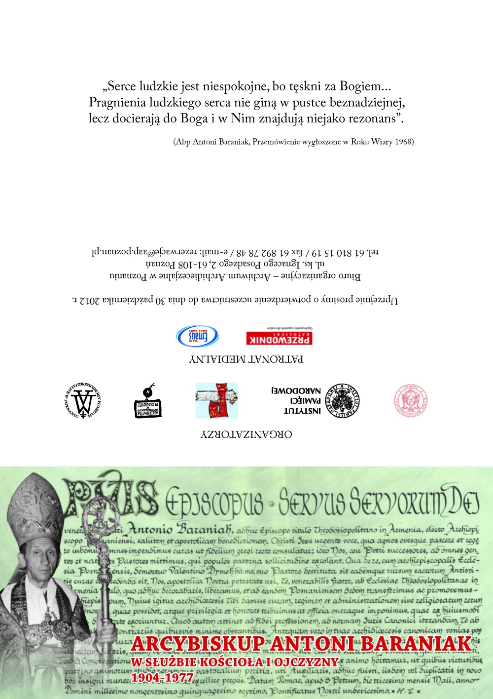 • godz. 10.45 – otwarcie wystawy fotograficznej poświęconej życiu i działalności Metropolity Poznańskiego „Da mihi animas, caetera tolle. Arcybiskup Antoni Baraniak 1904-1977”. Wystawa będzie czynna do 17 listopada 2012 r.