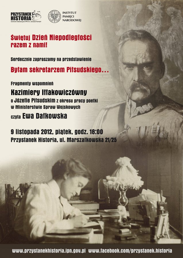 „Byłam sekretarzem Piłsudskiego…” Ewa Dałkowska czyta fragmenty wspomnień Kazimiery Iłłakowiczówny – Warszawa, 9 listopada, „Przystanek Historia” – Centrum Edukacyjne IPN im. Janusza Kurtyki, Marszałkowska 21/25