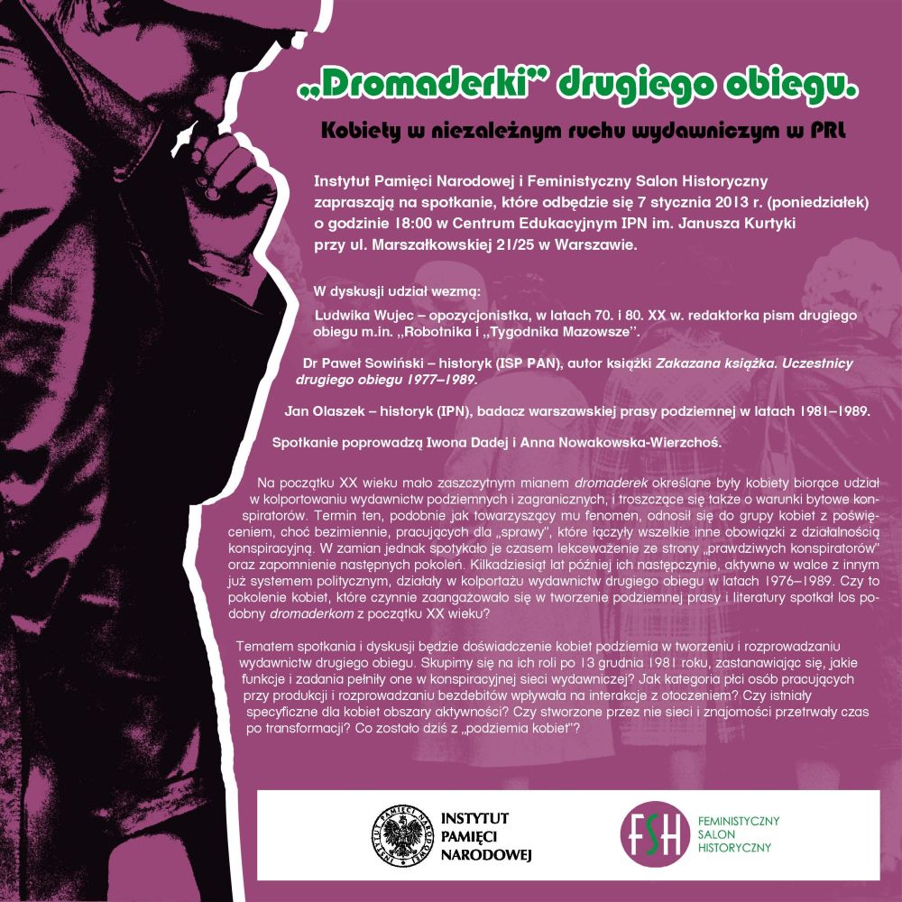 Instytut Pamięci Narodowej i Feministyczny Salon Historyczny zapraszają na spotkanie, które odbędzie się 7 stycznia 2013 r. (poniedziałek) o godzinie 18:00 w Centrum Edukacyjnym IPN im. Janusza Kurtyki przy ul. Marszałkowskiej 21/25 w Warszawie.