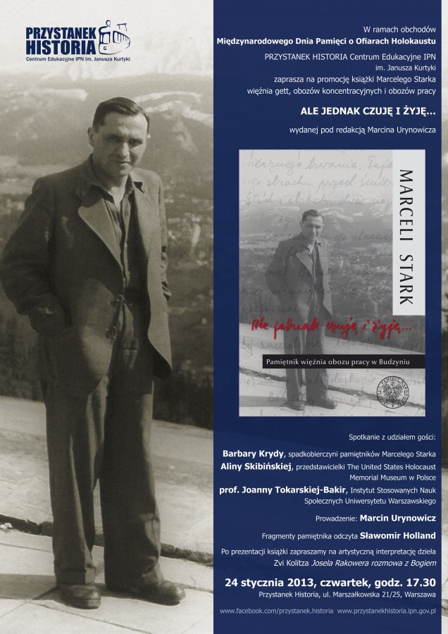 Promocja wspomnień Marcelego Starka, więźnia gett i obozów koncentracyjnych, zatytułowanych „Ale jednak czuję i żyję… Pamiętnik więźnia obozu pracy w Budzyniu”, wydanych w opracowaniu i pod redakcją naukową Marcina Urynowicza. Fragmenty pamiętnika odczyta Sławomir Holland. Po prezentacji książki – artystyczna interpretacja dzieła Zvi Kolitza „Josela Rakowera rozmowa z Bogiem”.