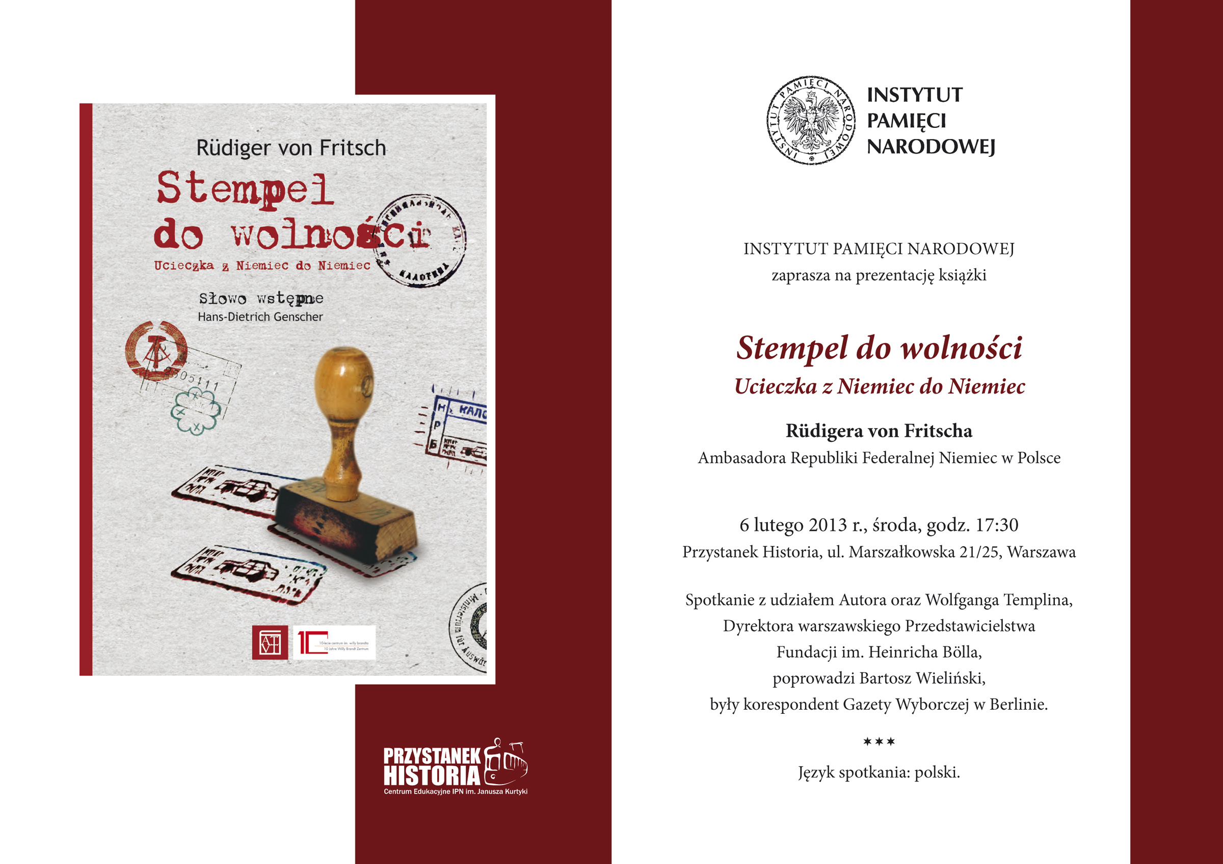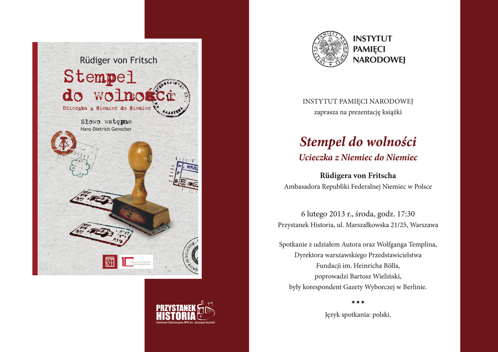 W środowy wieczór w Centrum Edukacyjnym IPN Przystanek Historia zebrało się kilkadziesiąt osób, by poznać opowieść jak z najlepszego kina akcji. Ambasador Niemiec w Polsce czytał fragmenty swojej książki „Stempel do wolności. Ucieczka z Niemiec do Niemiec”, opowiadającej tym, jak czterdzieści lat temu wraz z bratem pomógł wydostać się z NRD swojemu kuzynowi i jego kolegom. Przygotowali dla nich fałszywe paszporty i przez pół Europy holowali do wolności. W spotkaniu, które poprowadził Bartosz Wieliński, były korespondent „Gazety Wyborczej” w Berlinie, wziął też udział Wolfgang Templin, dyrektor warszawskiego przedstawicielstwa Fundacji im. Heinricha Bölla.