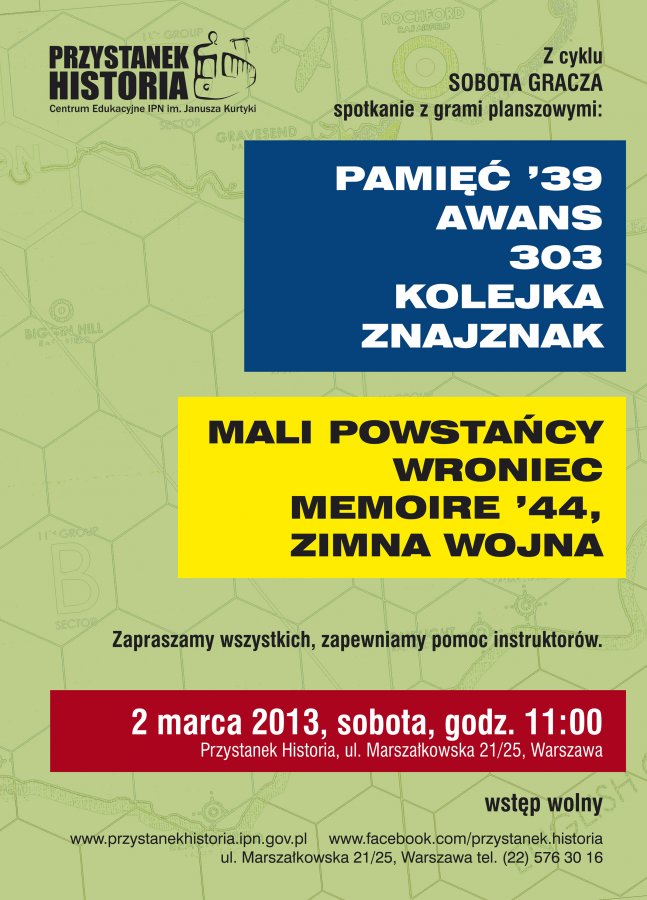 Z cyklu „Sobota gracza” spotkanie z grami planszowymi o tematyce historycznej. Nasi instruktorzy pomogą w wyborze tytułu i wytłumaczą zasady. Będzie można zagrać w planszówki wydane przez IPN – Pamięć ’39, Awans, 303, Kolejkę i ZnajZnak, a także w gry innych wydawnictw: Małych Powstańców, Wrońca, Memoire ’44, Zimną Wojnę oraz wiele innych tytułów.