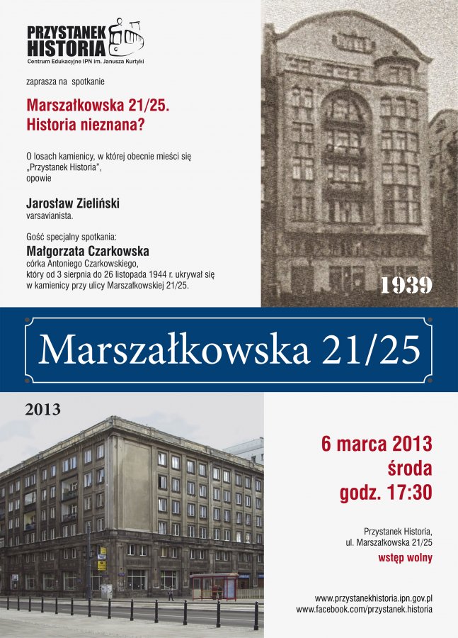 Co wiadomo o losach kamienicy, w której obecnie mieści się Centrum Edukacyjne IPN Przystanek Historia? Opowiedzą o tym znany varsavianista Jarosław Zieliński oraz Małgorzata Czarkowska, córka Antoniego Czarkowskiego, jednego z tzw. Robinsonów, który od 3 sierpnia do 26 listopada 1944 r. ukrywał się w kamienicy przy ulicy Marszałkowskiej 21/25.