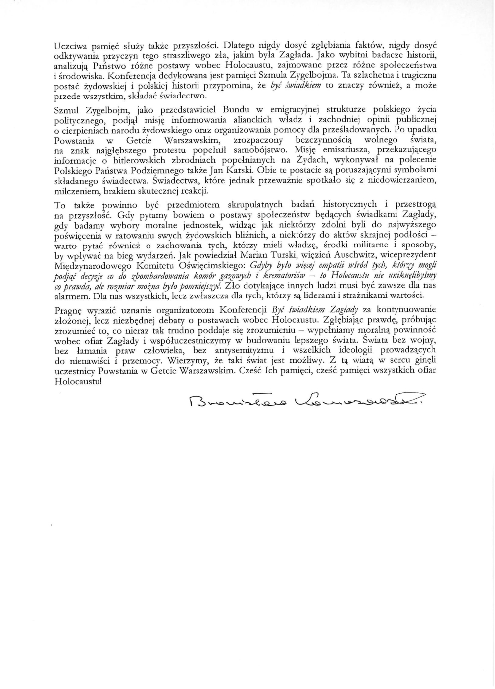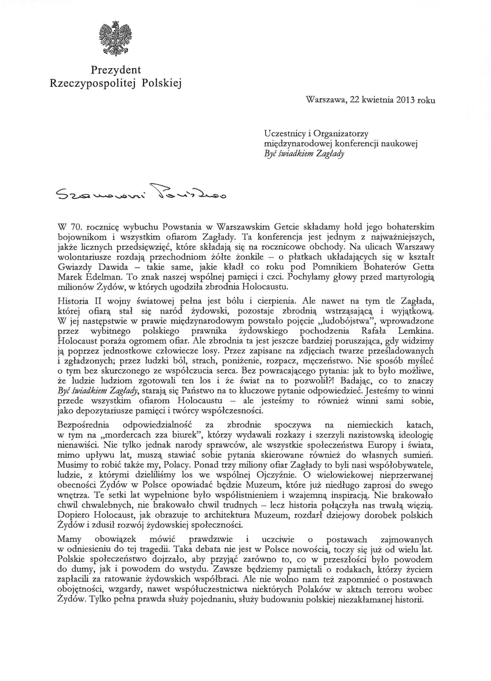 W liście skierowanym do uczestników konferencji, a odczytanym przez prezesa IPN dra Łukasza Kamińskiego, prezydent Komorowski podkreślił, że choć odpowiedzialność za Holokaust spoczywa na nazistowskich Niemczech, to jednak społeczeństwa całego świata muszą stawiać sobie pytania skierowane także do własnych sumień.