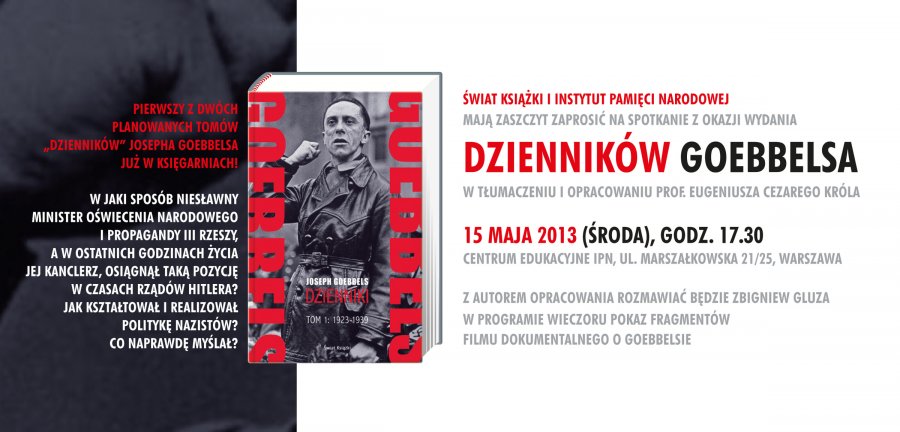 Zapraszamy na spotkanie dyskusyjne w Centrum Edukacyjnym IPN Przystanek Historia, poświęcone nowo wydanym „Dziennikom” Josepha Goebbelsa w tłumaczeniu i opracowaniu prof. Eugeniusza Cezarego Króla. Z autorem opracowania rozmawiać będzie Zbigniew Gluza. W programie wieczoru pokaz fragmentów filmu dokumentalnego o Goebbelsie.