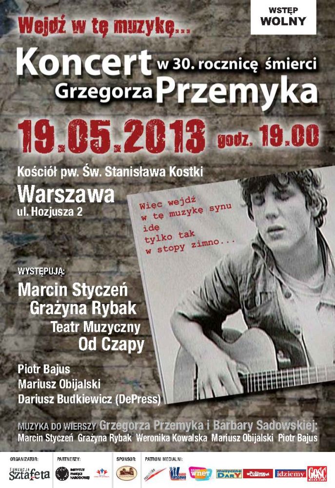 W niedzielę, 19 maja 2013, w stołecznym kościele pw. św. Stanisława Kostki (ul. Hozjusza 2) odbędzie się koncert w 30. rocznicę śmierci Grzegorza Przemyka.  Śmiertelnie skatowany przez milicję Przemyk, syn opozycyjnej poetki Barbary Sadowskiej, został pochowany 19 maja 1983 roku. To jedna z najgłośniejszych zbrodni PRL-u lat 80.