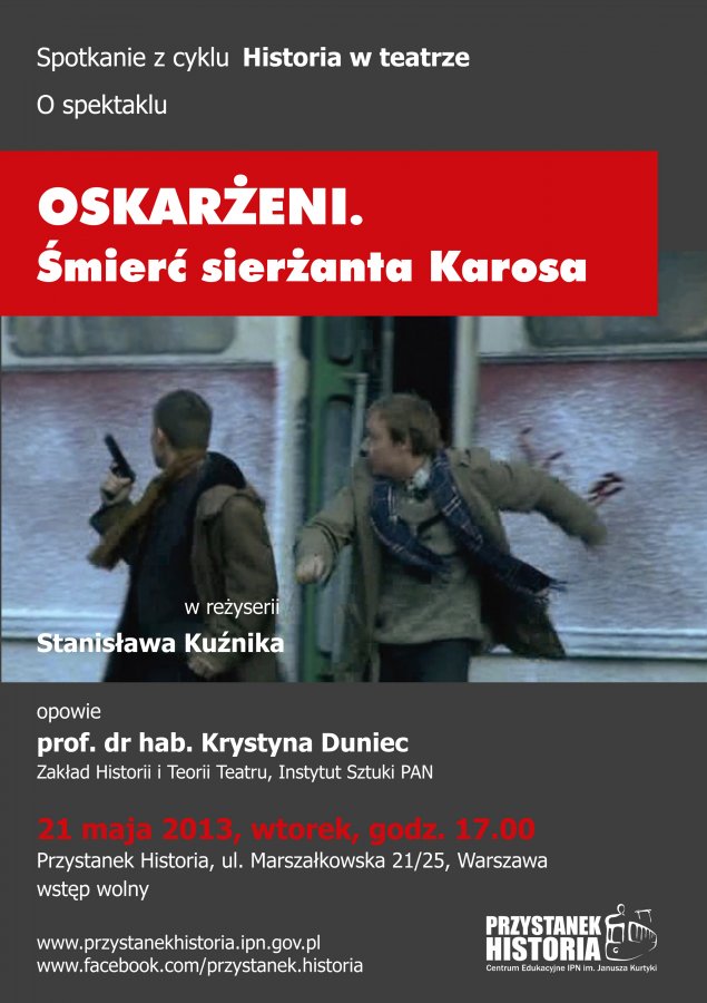 O sztuce „Oskarżeni. Śmierć sierżanta Karosa” w reżyserii Stanisława Kuźnika opowie prof. dr hab. Krystyna Duniec z  Instytutu Sztuki PAN.