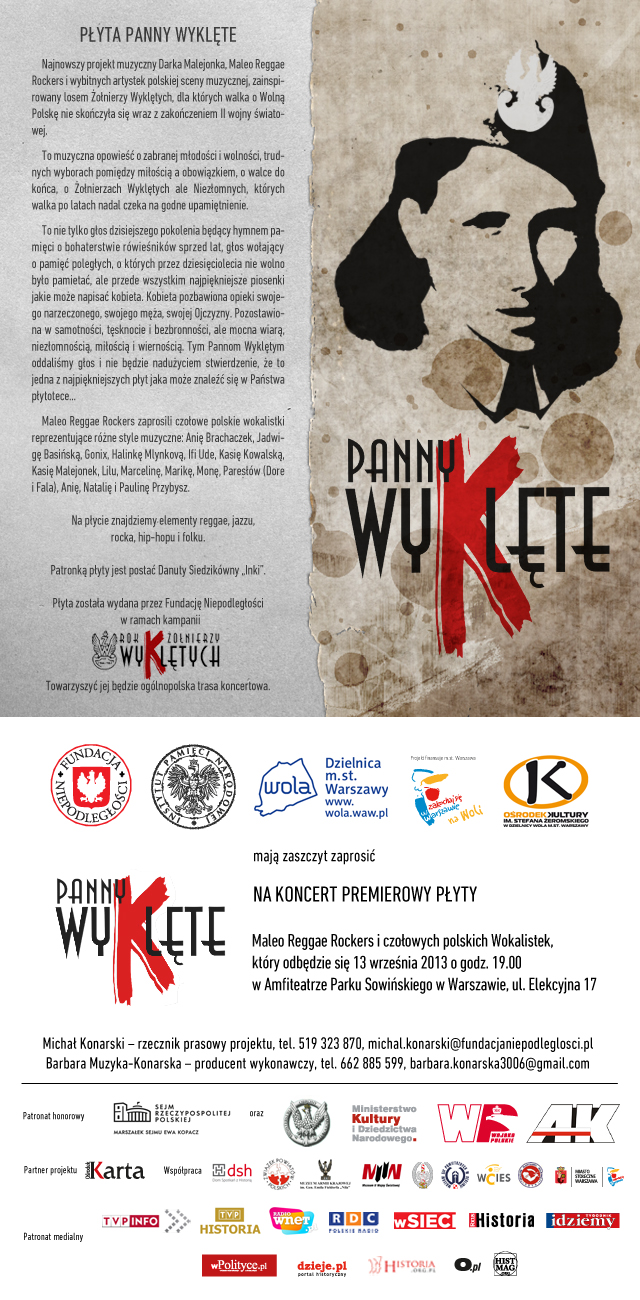 W piątek 13 września 2013, o godz. 19:00, w Amfiteatrze w Parku Sowińskiego na Woli (ul. Elekcyjna 17) odbędzie się koncert inaugurujący płytę „Panny Wyklęte”. Wstęp wolny. Serdecznie zapraszamy!