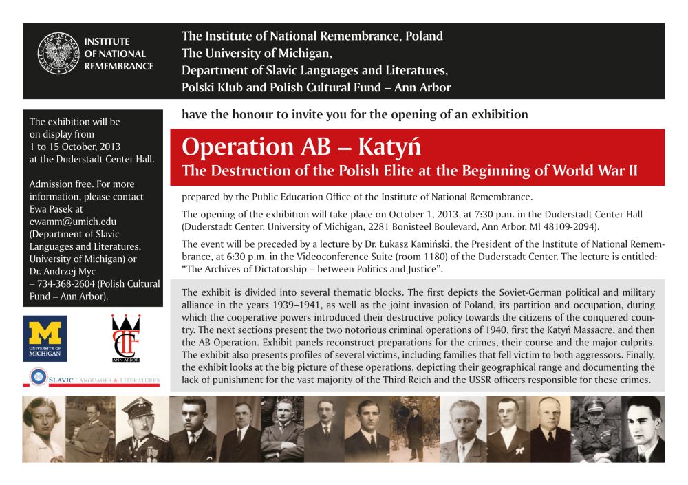 1 października 2013 r. w Duderstadt Center Hall (Duderstadt Center, University of Michigan, 2281 Bonisteel Boulevard, Ann Arbor, MI 48109-2094) odbyło się uroczyste otwarcie wystawy „Zagłada polskich elit. Akcja AB – Katyń", przygotowanej przez Instytut Pamięci Narodowej. W uroczystości wziął udział Prezes Instytutu Pamięci Narodowej dr Łukasz Kamiński.