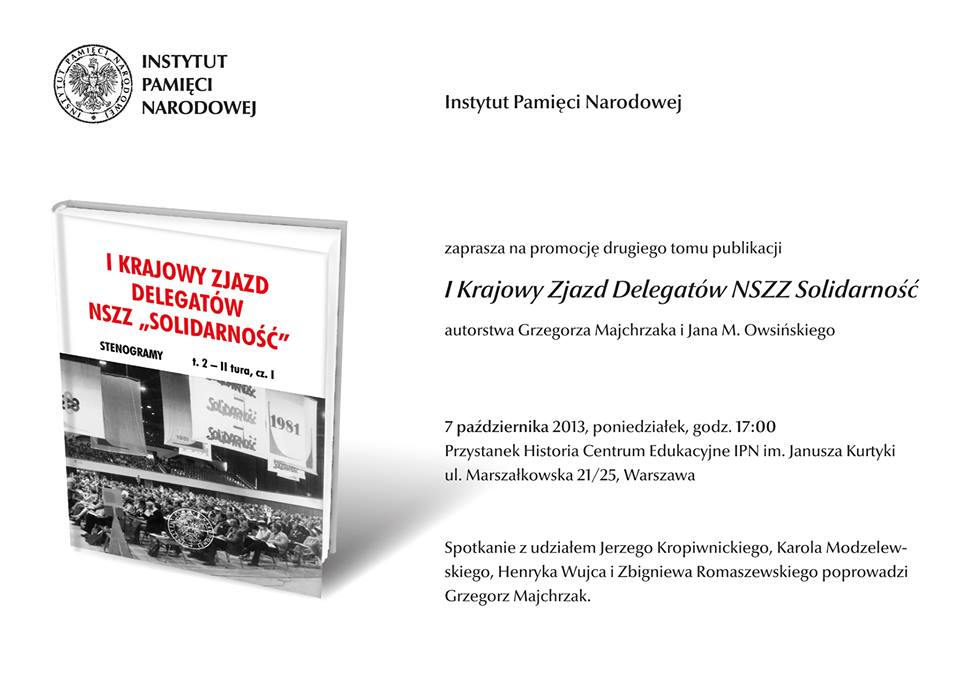 7 października 2013 zapraszamy do stołecznego Centrum Edukacyjnego IPN Przystanek Historia na promocję wydanego w dwóch częściach drugiego tomu publikacji „I Krajowy Zjazd Delegatów NSZZ »Solidarność«". Publikacja zawiera stenogramy II tury obrad w opracowaniu Grzegorza Majchrzaka i Marka Owsińskiego.