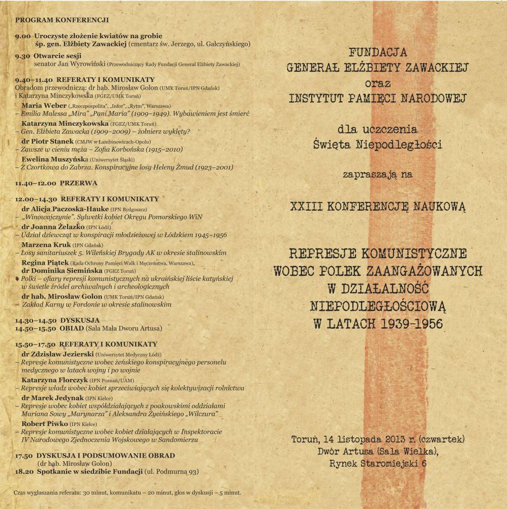 Fundacja Generał Elżbiety Zawackiej w Toruniu oraz Instytut Pamięci Narodowej zapraszają na 23. konferencję naukową „Represje komunistyczne wobec Polek zaangażowanych w działalność niepodległościową w latach 1939–1956", organizowaną dla uczczenia Święta Niepodległości.