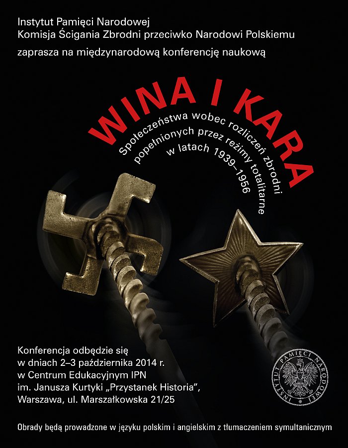 W dniach 2–3 października 2014 r w Centrum Edukacyjnym IPN im. Janusza Kurtyki Przystanek Historia w Warszawie, przy ul. Marszałkowskiej 21/25, odbyła się międzynarodowa konferencja naukowa „Wina i kara. Społeczeństwa wobec rozliczeń zbrodni popełnionych przez reżimy totalitarne w latach 1939–1956".