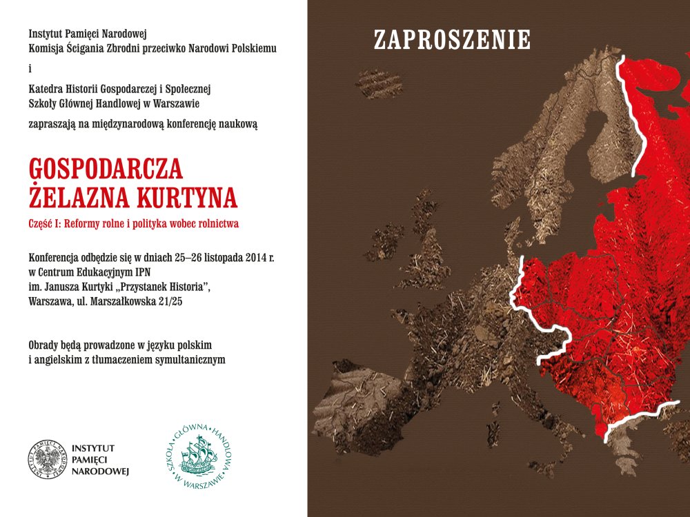 Instytut Pamięci Narodowej – Biuro Edukacji Publicznej oraz Szkoła Główna Handlowa w Warszawie – Katedra Historii Gospodarczej i Społecznej zapraszają do udziału w międzynarodowej konferencji naukowej „Gospodarcza Żelazna Kurtyna", część I: „Reformy rolne i polityka wobec rolnictwa", która odbędzie się w Warszawie w dniach 25–26 listopada 2014 r.