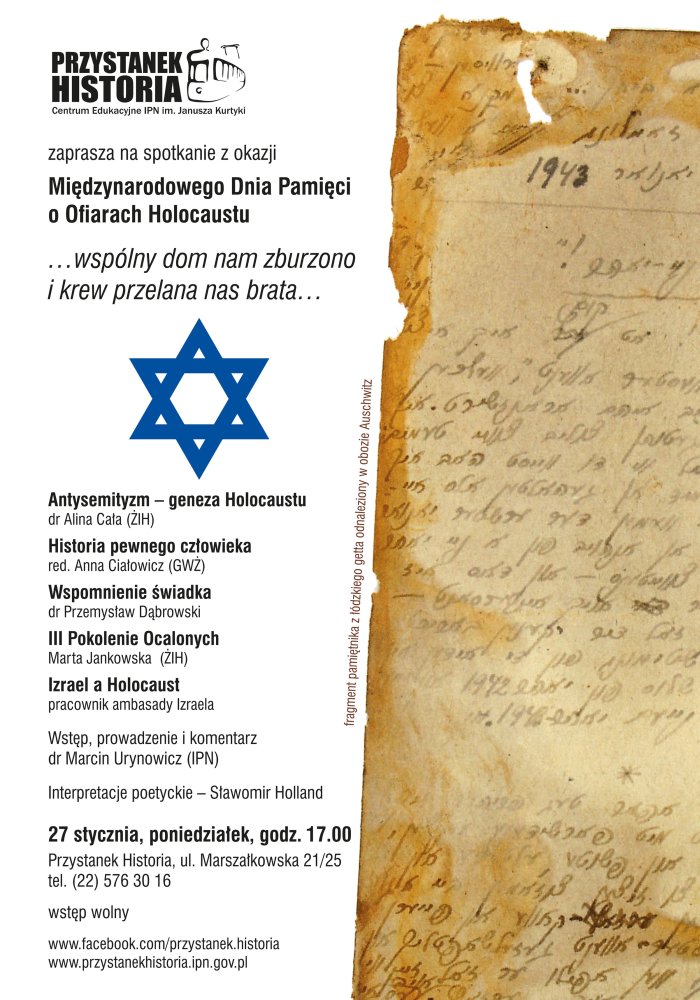 W ramach obchodów tego święta 27 stycznia 2014, o godz. 17:00, Przystanek Historia – Centrum Edukacyjne IPN im. Janusza Kurtyki zaprasza na spotkanie upamiętniające Ofiary Holokaustu. Prelekcje na temat Zagłady wygłoszą znani historycy: