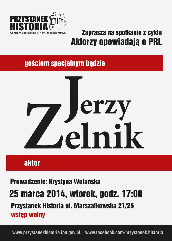 Centrum Edukacyjne IPN im. Janusza Kurtyki Przystanek Historia zaprasza na spotkanie z cyklu Aktorzy opowiadają o PRL, w ramach którego znani autorzy teatralni i filmowi opowiadają o początkach swojej kariery oraz życiu codziennym ludzi teatru, kina i telewizji w Polsce Ludowej. Gościem specjalnym będzie Jerzy Zelnik – znany aktor teatralny, filmowy i telewizyjny, który już u progu aktorskiej kariery zasłynął jako odtwórca roli Ramzesa XIII w ekranizacji Faraona (reż. Jerzy Kawalerowicz).