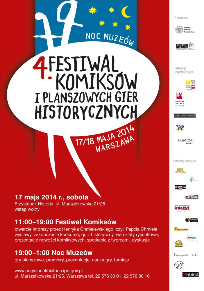 Przystanek Historia – Centrum Edukacyjne Instytutu Pamięci Narodowej im. Janusza Kurtyki po raz czwarty zaprasza na spotkania z komiksami i grami planszowymi. Tym razem proponujemy bogatszą formułę i w ramach Nocy Muzeów łączymy dwie imprezy, dotychczas funkcjonujące oddzielnie: czerwcowy Festiwal Komiksu Historycznego oraz majowy Nocny Festiwal Planszowych Gier Historycznych. Partnerami wydarzenia są: Narodowe Centrum Kultury i Muzeum Historii Polski oraz wydawnictwa: Nowa Era, Prószyński i Sp-ka, Egmont Polska oraz Zin Zin Press.