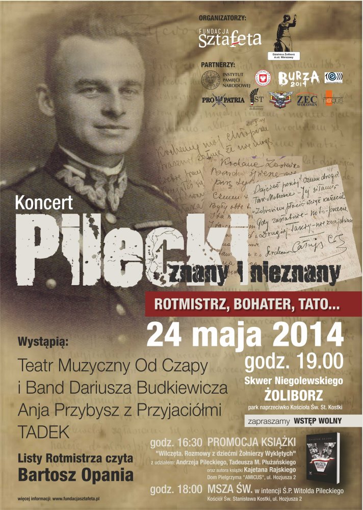Zapraszamy na koncert upamiętniający „rotmistrza, bohatera, tatę" – jak napisali organizatorzy. W koncercie na skwerze Niegolewskiego (park naprzeciwko kościoła św. Stanisława Kostki na Żoliborzu) wystąpią „TADEK" Polkowski, Teatr Muzyczny Od Czapy i Band Dariusza Budkiewicza, Anja Przybysz z Przyjaciółmi. Rozpoczęcie koncertu – godz. 19.00.