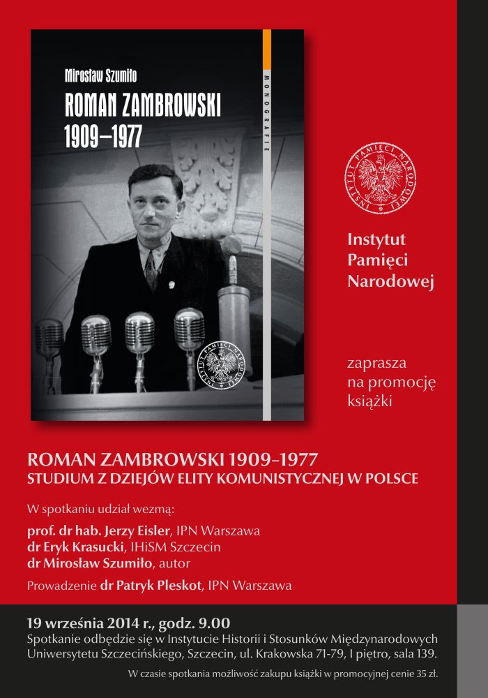 Instytut Pamięci Narodowej zaprasza 19 września 2014 r., o godz. 9.00, na promocję książki „Roman Zambrowski 1909–1977. Studium z dziejów elity komunistycznej w Polsce" autorstwa Mirosława Szumiły.